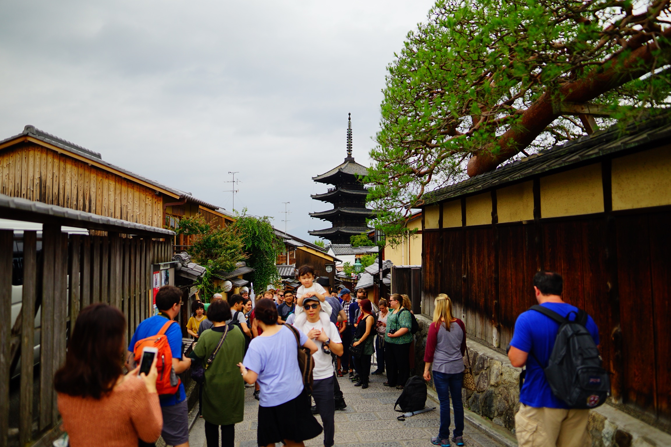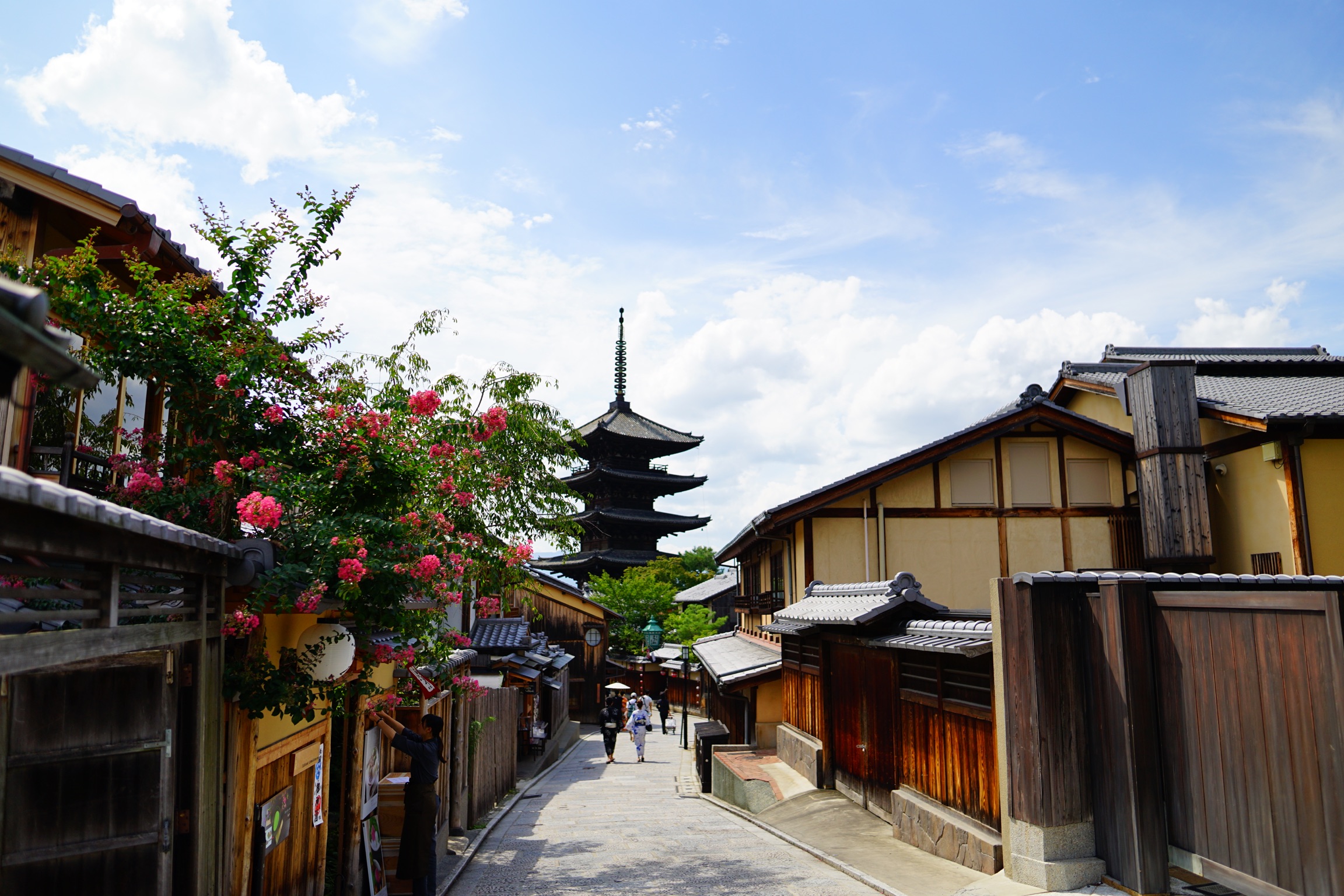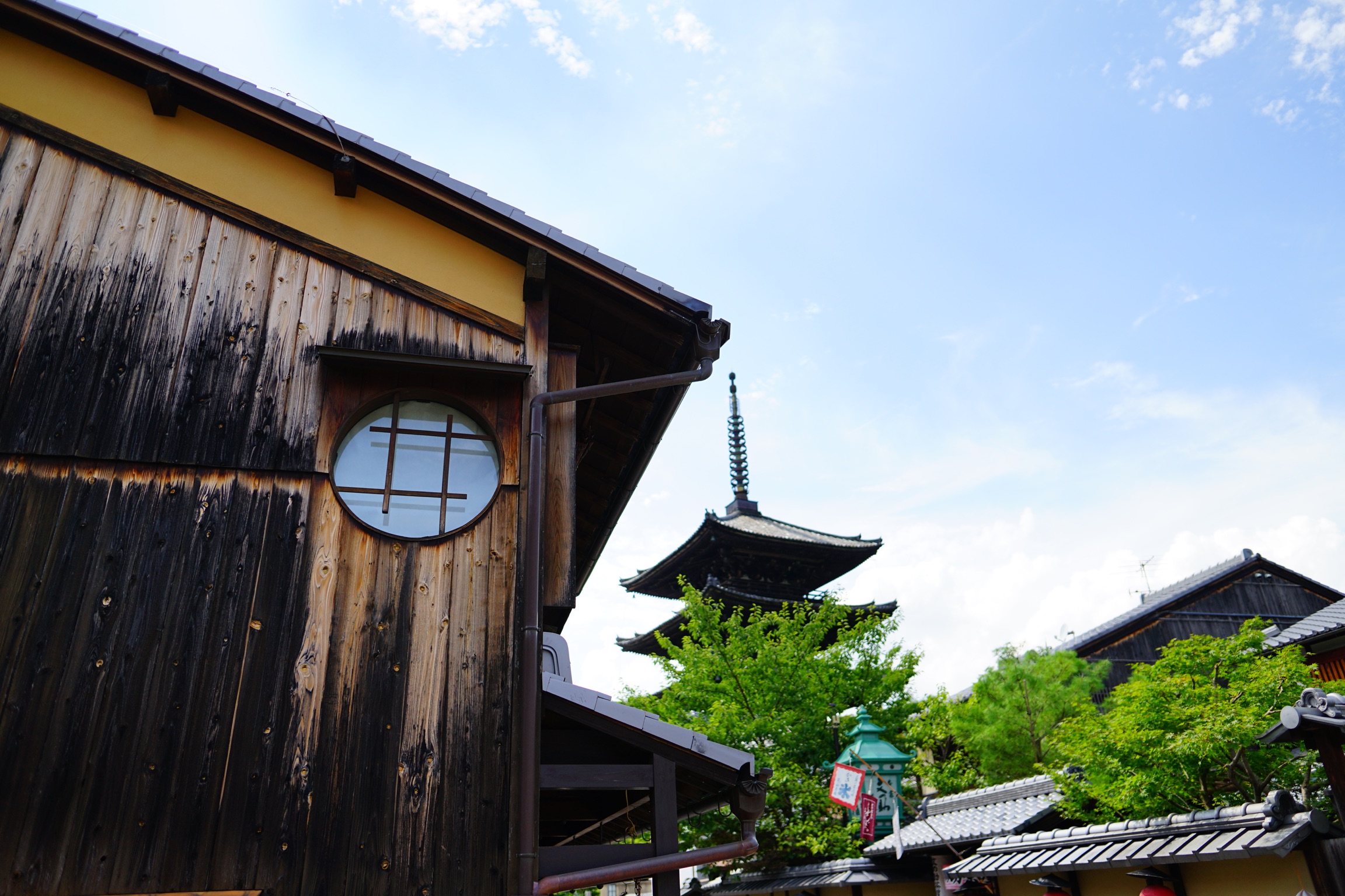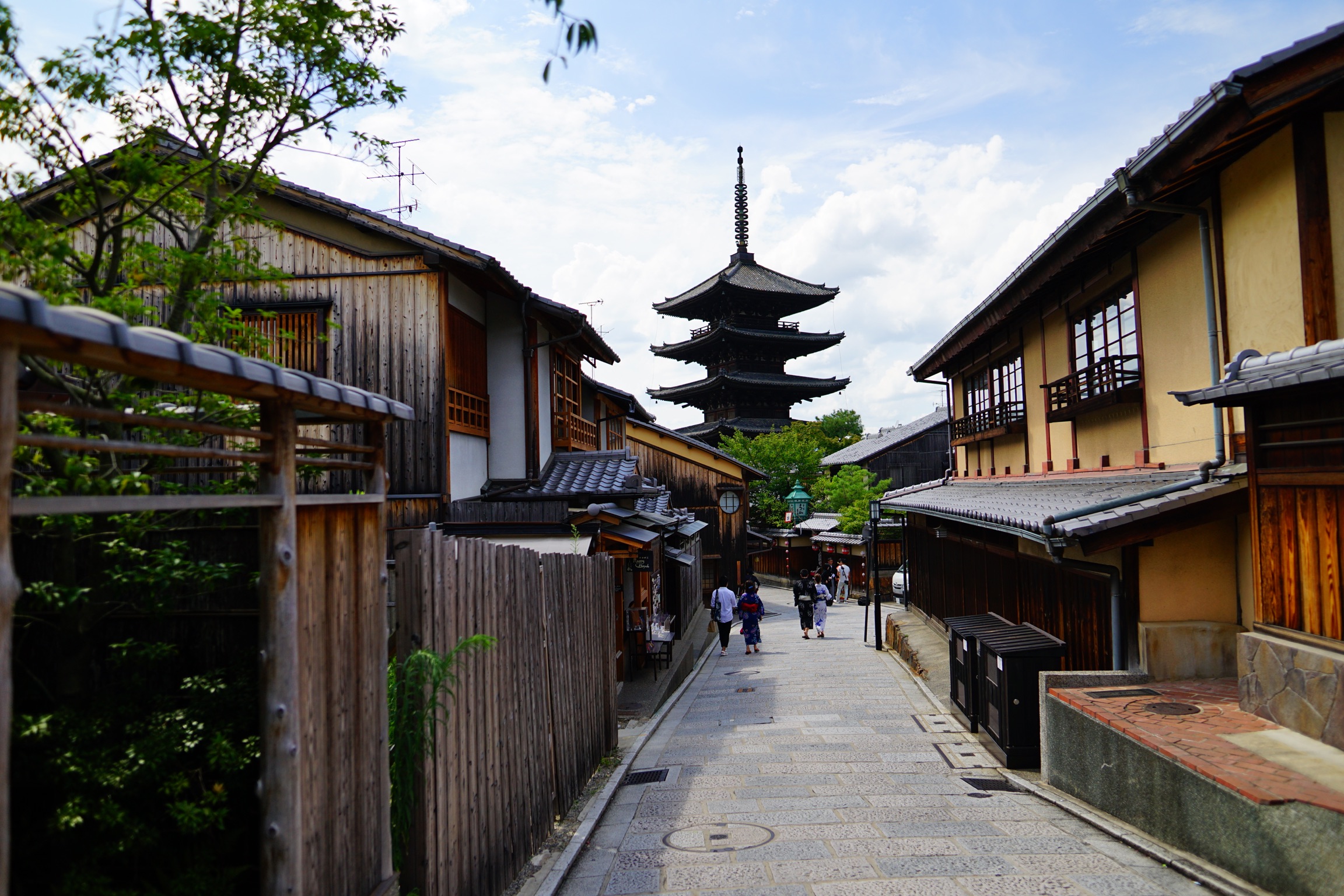 ここは京都 東山の産寧坂を降りてくると自然に目に飛び込んでくる景色です。産寧坂を下ってきて、この景色を見ずに二年坂に道を曲がってしまうともったいないです。二年坂へのわかれ道を曲がらずにそのまま真っすぐ行き、目の前の景色が広がった瞬間に五重の塔が見えます。仮に時代劇のセットだとしても、何一つ時代違いなものが無い景色です。ちょっとだけ、アンテナがあったりはしますが、、、。