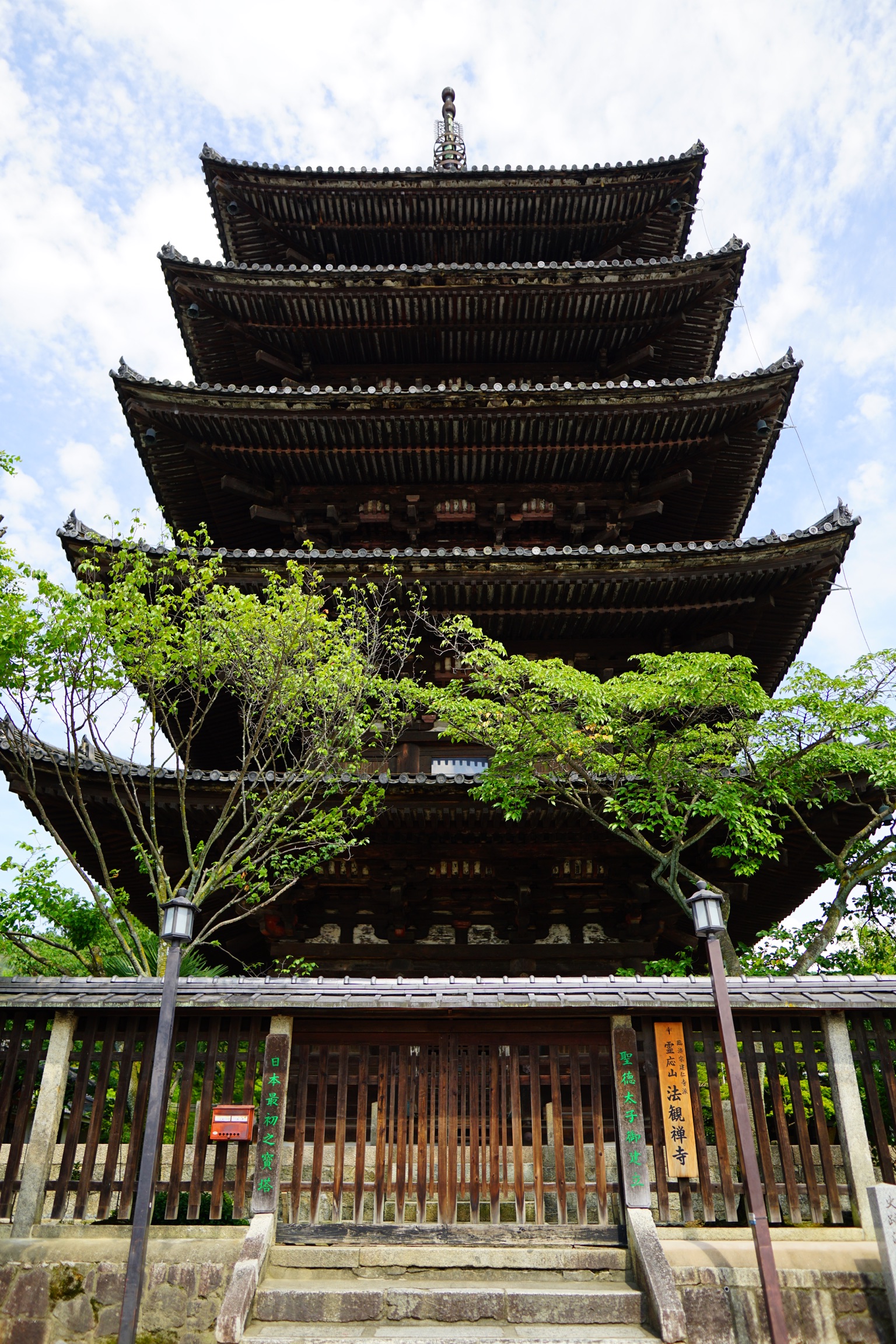 五重の塔はこれまで幾度かの火災に遭っては再建されてきて、現在の塔は室町時代の再建となるのですでに600年近く経っている非常に古い建築です。この坂道がこのようにきれいに整えられて景観的に素晴らしい佇まいを持つようになったのは割と近代になってからですが、塔の鄙びた古さを引き立てて調和の取れた町並みとなっています。