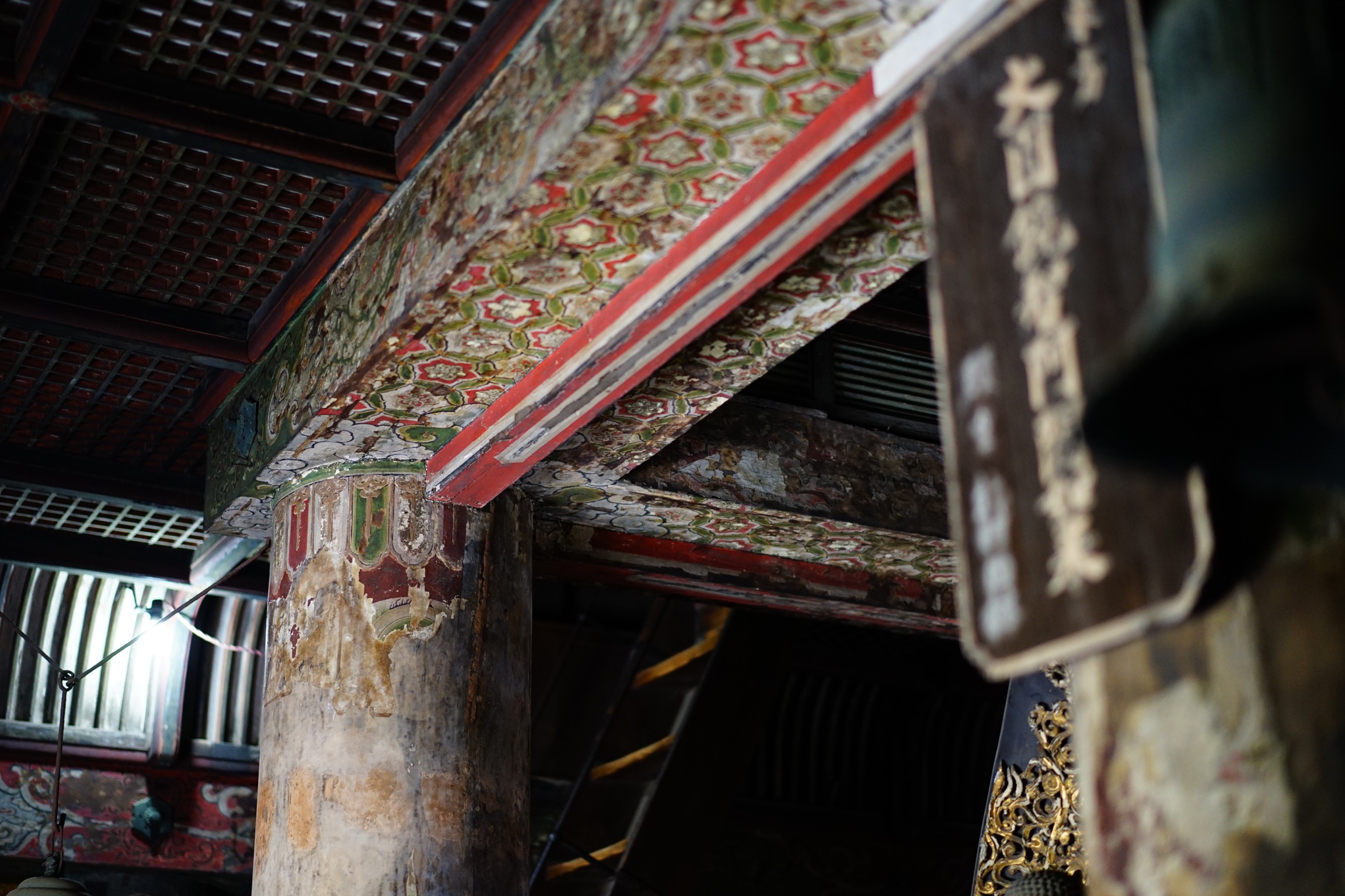 法観寺塔内部は外観の褐色一色と異なり、極彩色の着色や幾何学的な紋様が描かれていて鮮やかな印象です。