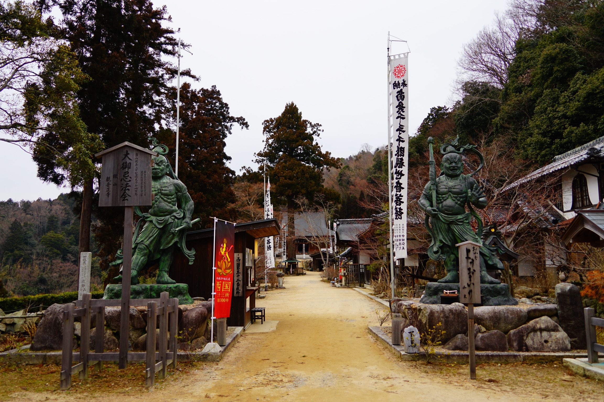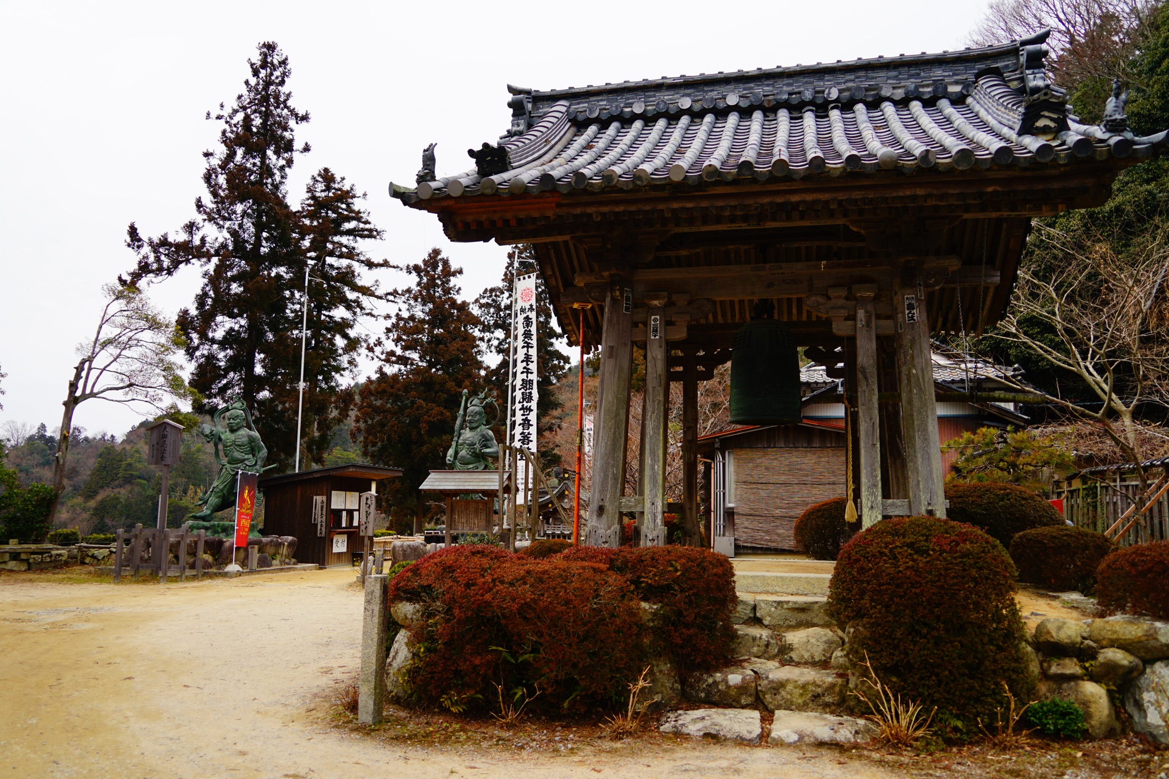 登山道は途中特に分岐道なども無く迷わずにお寺に着くことが出来ました。最初に見えてくるのは鐘楼ですが、その奥に門の無い露出の仁王像が寺の入口を守っています。