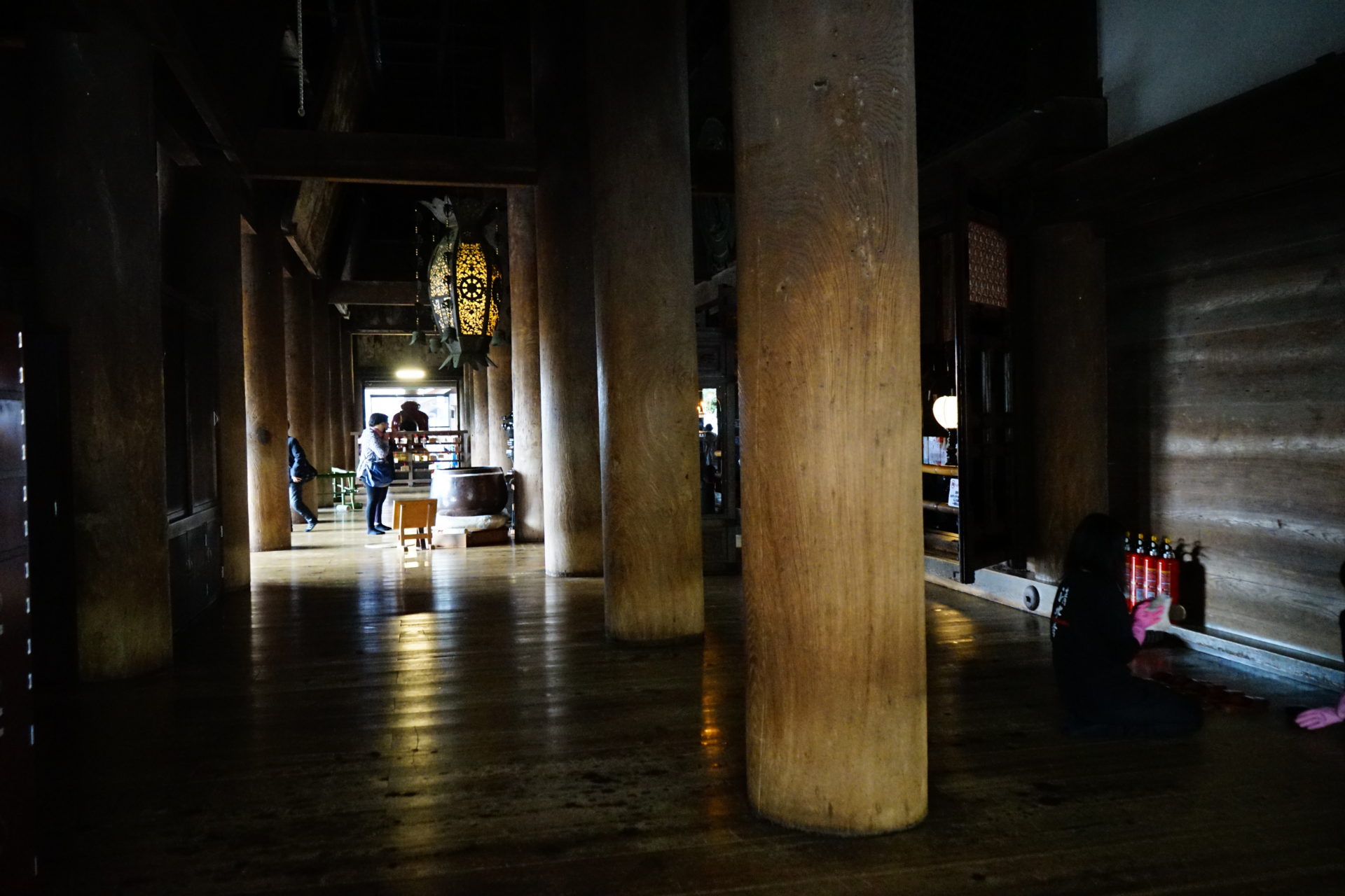 本堂の舞台は本来、御本尊の観世音様に舞いを奉納するための舞台であり外を見るための展望台ではありません。現代でも法会(ほうえ・お寺にとっての大事な宗教行事)の際には舞いの舞台として使用されています。雨の排水を考慮しているのか、この舞台は外側に多少傾斜している(ように感じる)ため怖さを感じます。というか、この江戸時代初期の再建になる建築が適宜修繕されているとは言え、年間1,000万人は来場しているであろう人の重みが毎日舞台にのしかかっていて、構造的な疲労度も相当だろうなと感じたりしますので、ガタンと崩れたりしないかとヒヤヒヤします。なお、清水寺塔頭の成就院の日記によると、昔にこの舞台から飛び降りた人は237人もいたそうです。また、この本堂の周りをぐるぐると昼夜を問わずに回る参拝手法があり、ここから「堂々めぐり」という言葉が生まれたそうです。