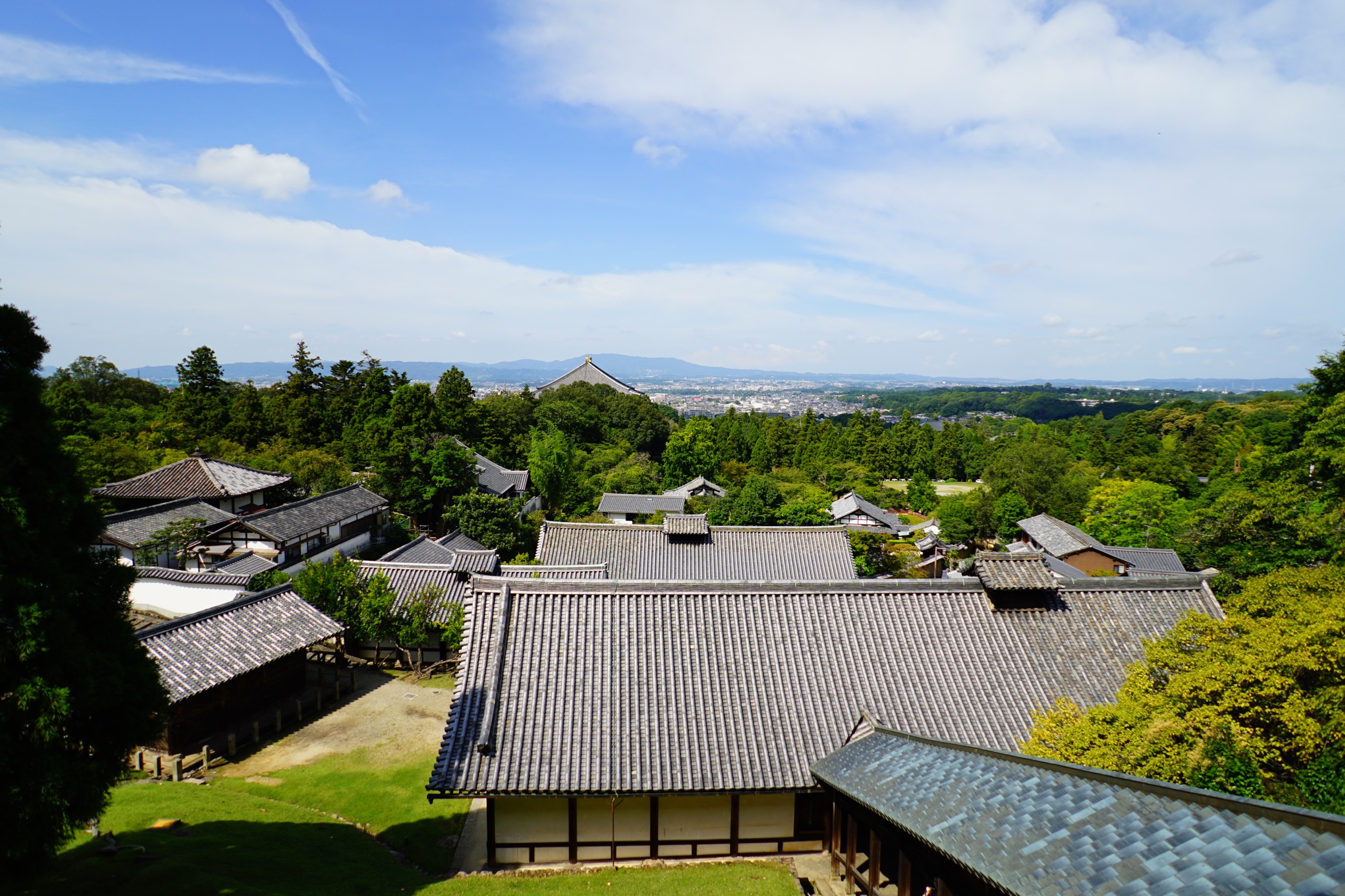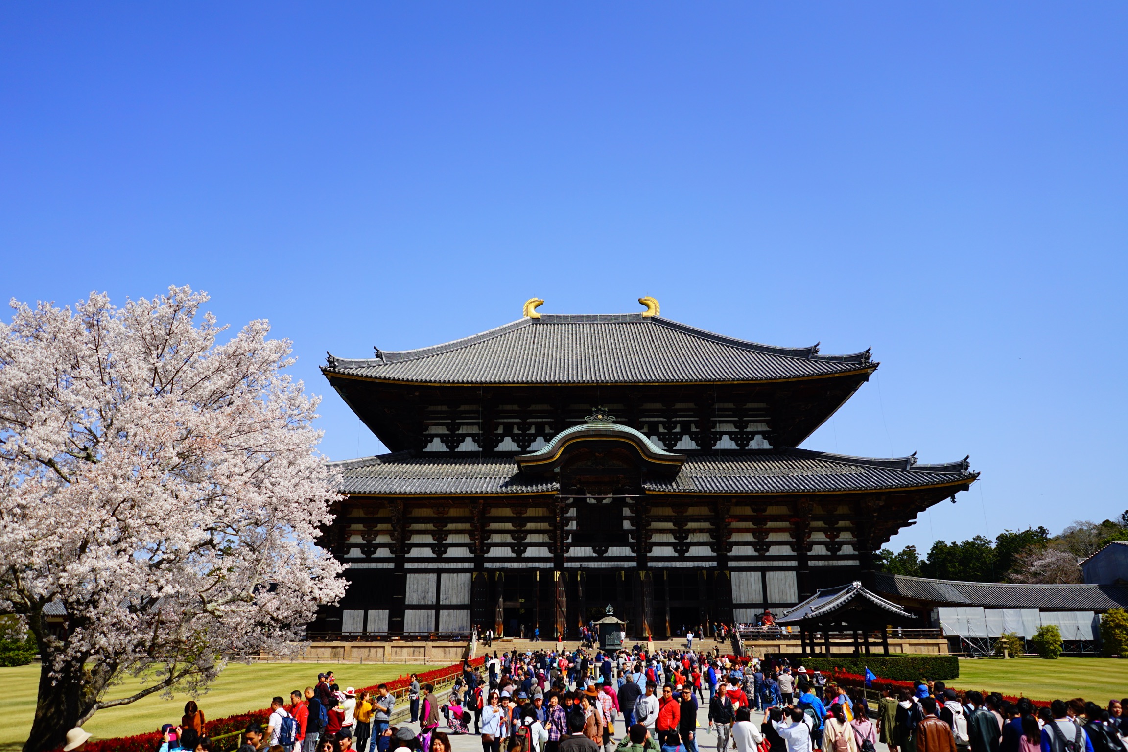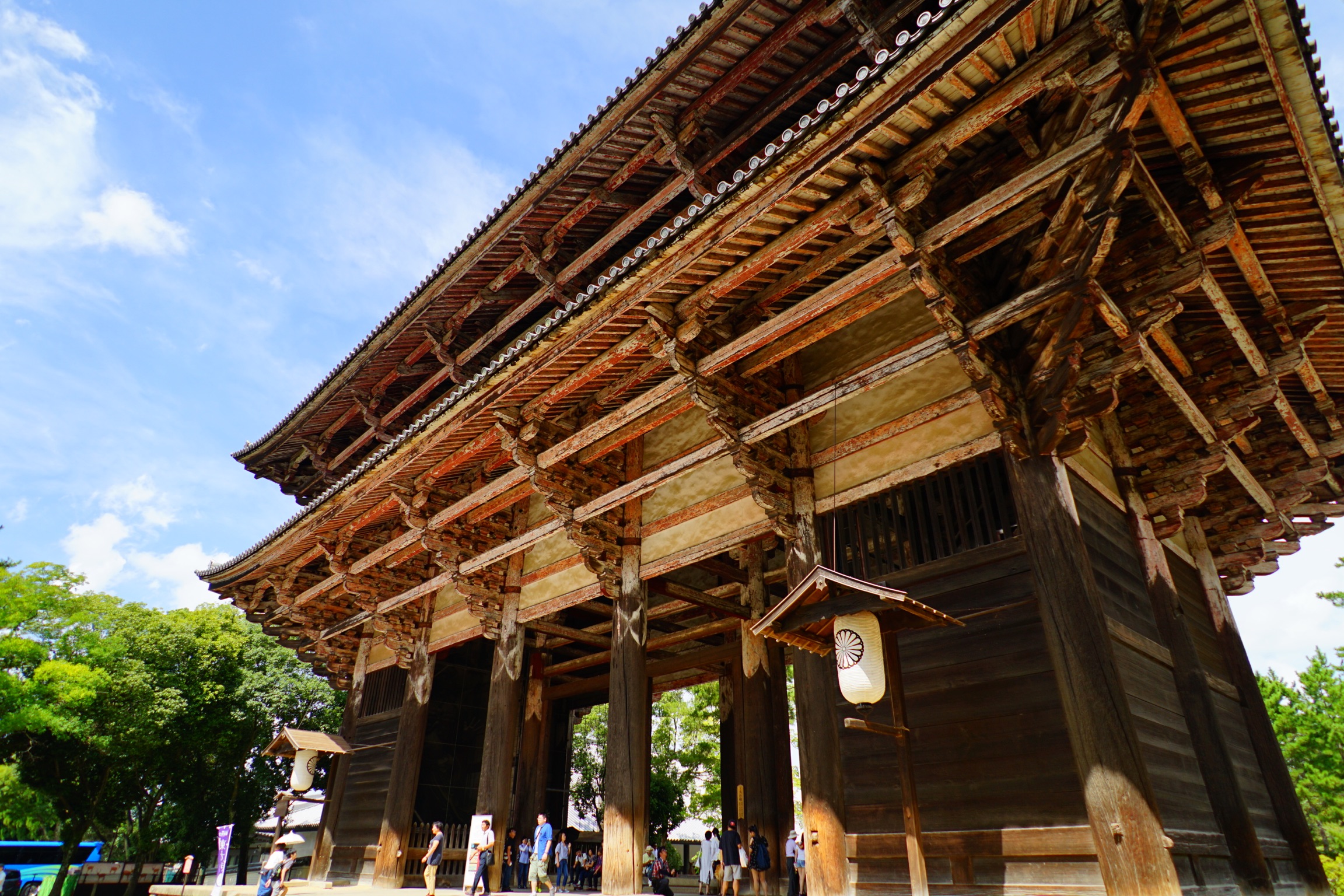 大仏殿は高さ49m、横幅57mの世界最大級の木造建築です。屋根の上の両サイドにシャチホコのような形の鴟尾(しび)が乗っていますが、小さく見えますが実は高さ3mあり金箔1万枚使用しています。屋根瓦は11万枚使用しており、50年前の昭和の大修理の際には傷んだ瓦6万枚の交換作業に7年かかっています。