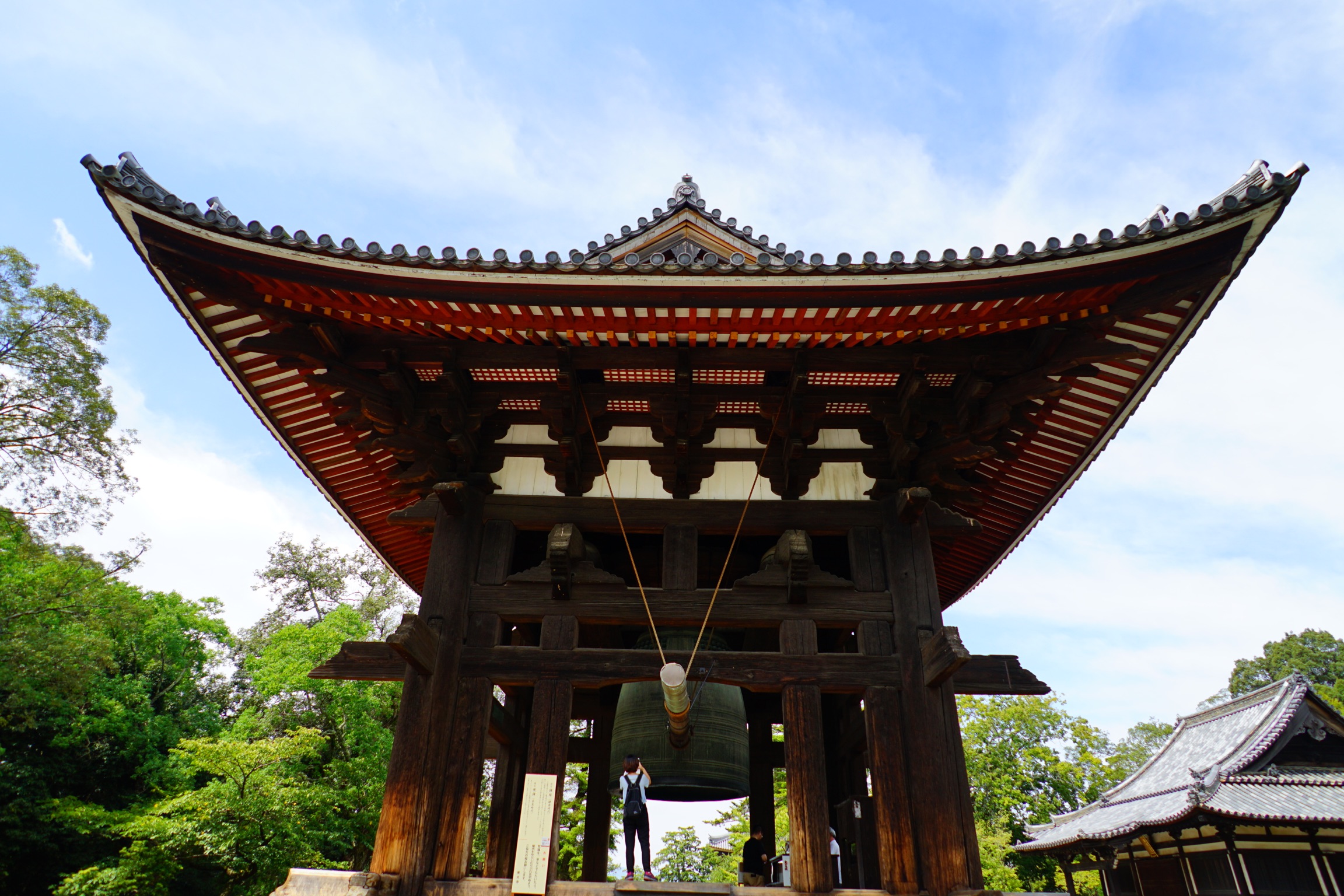 鐘楼は鎌倉時代の建立で国宝です。音響を広く拡散させるために板壁を用いずに、さらに音をこもらせるために屋根を大きく作ってあります。高さ13m。