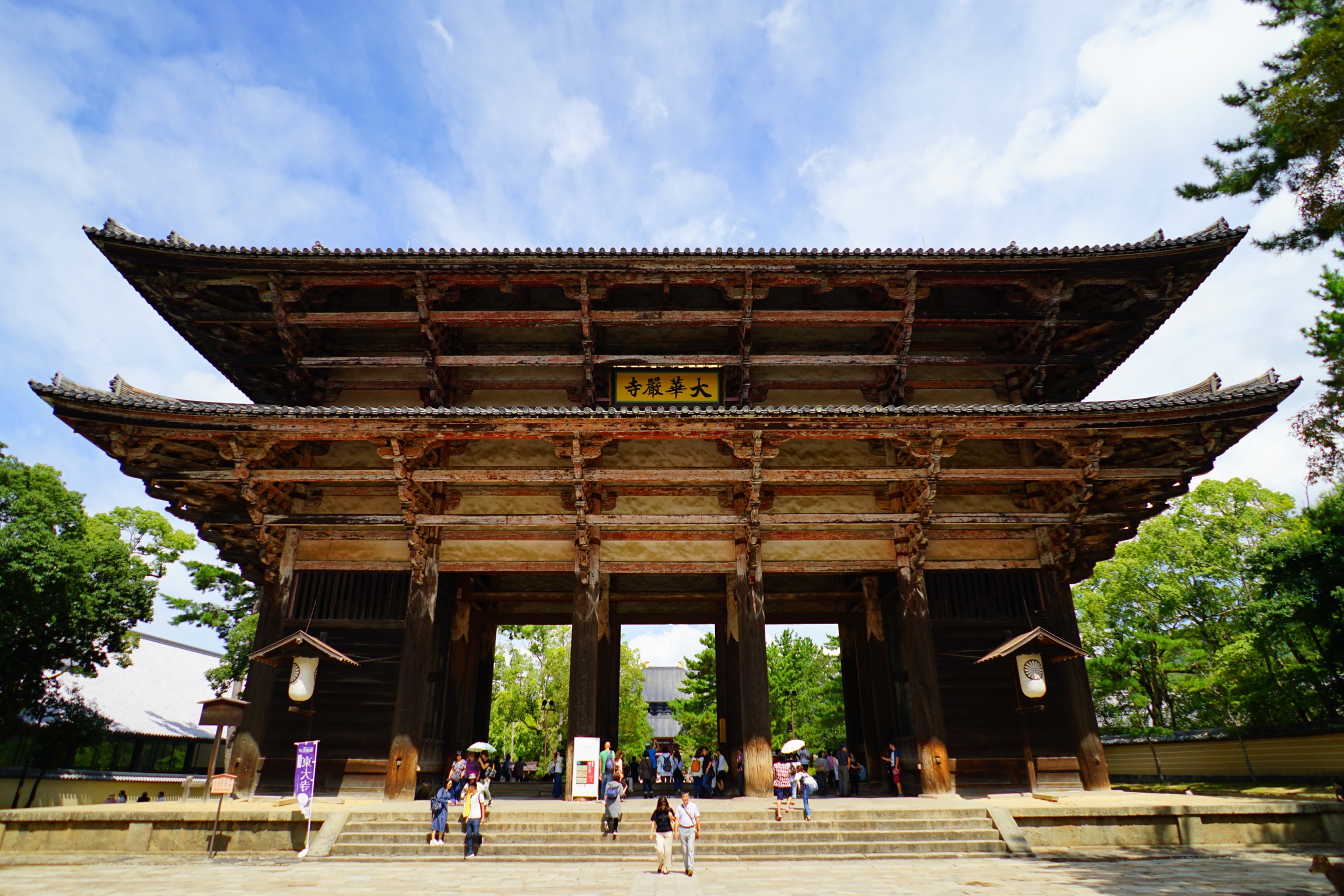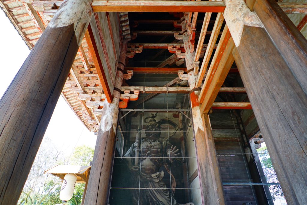 高さ25.5mの壮大な門です。奈良時代の南大門は倒壊してしまったために鎌倉時代に再建されています。と言っても800年以上も前の建築が現存しているのは凄いことです。そしてここを通る時は上を見上げて頂きたいです。天井が無く上部が見えるので、内部構造が良くわかります。ところで正面から見ると、通常外側を向いて訪問者を睨みつけている金剛力士像(仁王様)がありません。しかしご不在ではありません。この南大門の金剛力士像(国宝)は門の内側で向かい合うように立っておられます。高さ8.4m、重さ7トン、実際は5頭身ですが下から見ることによって7頭身に見えるように造られています。左側に立つのが阿形像(仏教では全ての始まりを表す)で運慶と快慶の作品、右側に立つのが吽形像(全ての終わり)で定覚と湛慶の作品です。仏師運慶をリーダーに、快慶も含めた弟子達と分業制で細かいパーツ6102個を作り、組み合わせて立像を作り上げています。しかも非常に短期間で製作が完了したと言います。向かい合って立つ理由は、「立場が異なる力のある者が居ると対立が起きるが、向かい合って力を合わせる」という意味が込められています。扁額にある「大華厳寺」とは東大寺の別の名です。