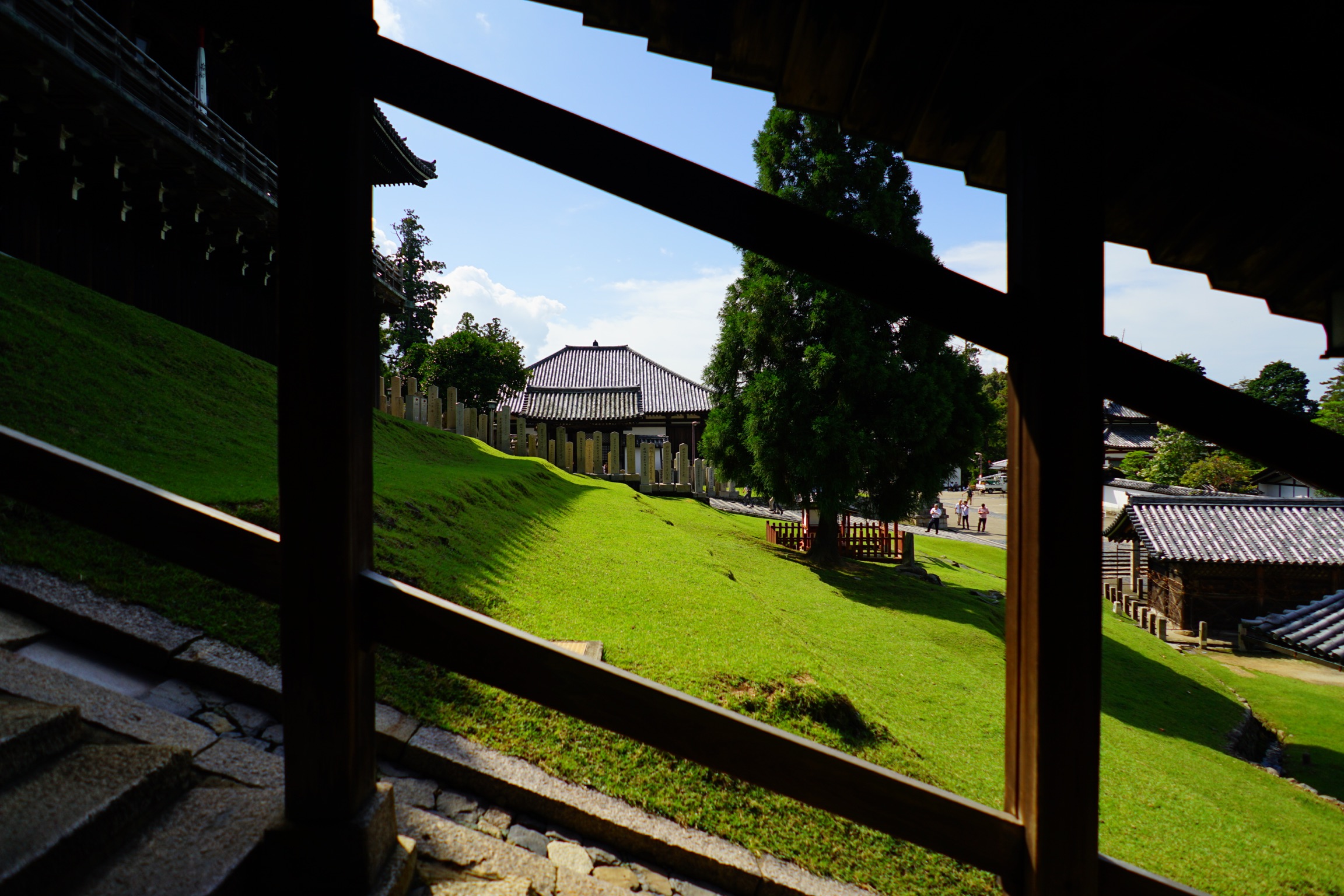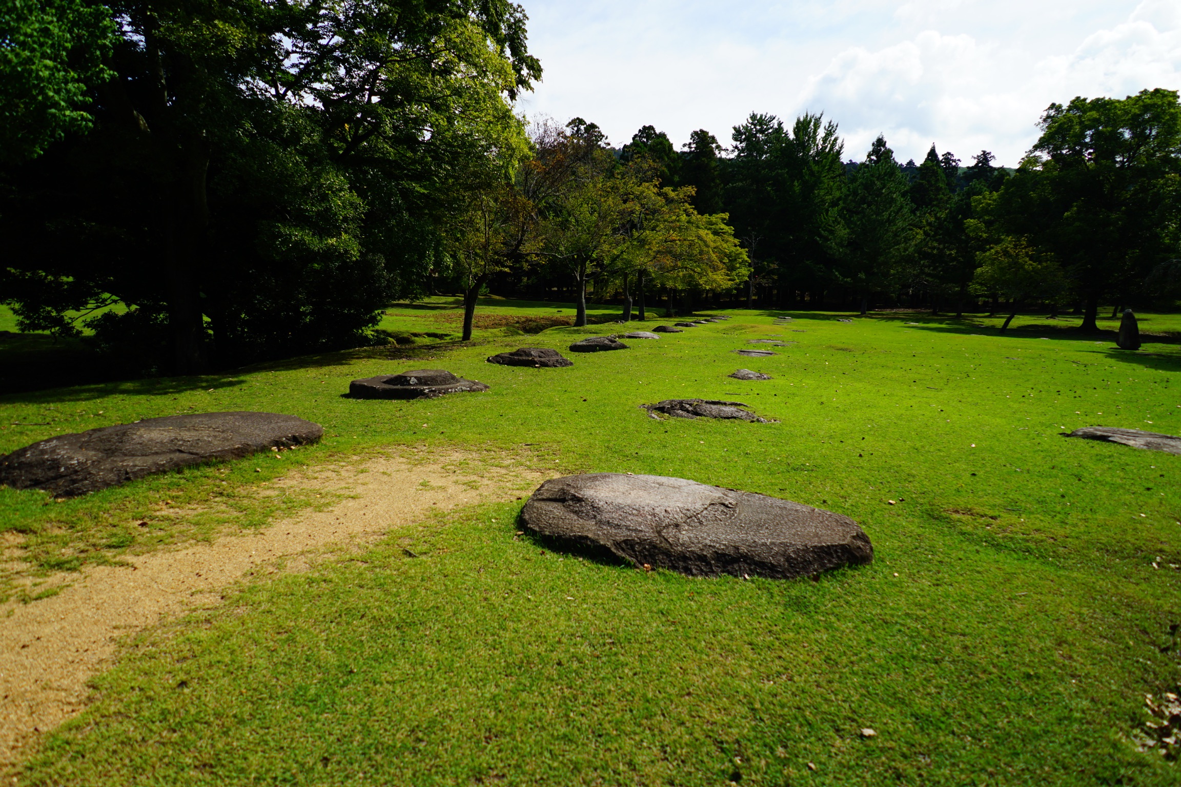【大仏殿の裏を回って二月堂へ】戒壇堂からは大仏殿の裏を回って二月堂へ行く道があります。これを裏参道と言います。この辺の道も雰囲気が良く、観光客もそう多くはないので天平の時代の雰囲気を感じる事ができます。程なくすると、恐らく当時はここにも大きなお堂が建っていたのだろうと想像できる柱の基石が整然と並んでいる一帯があります。こういった歴史の名残や史跡を探して当時を想像するのは散歩の楽しみであります。