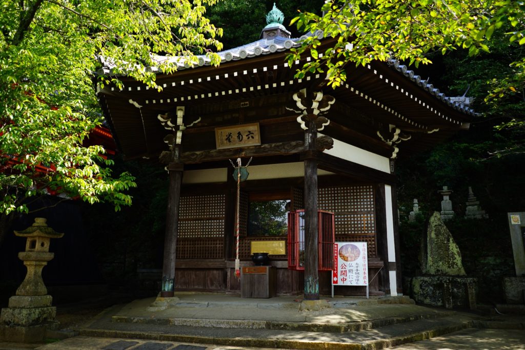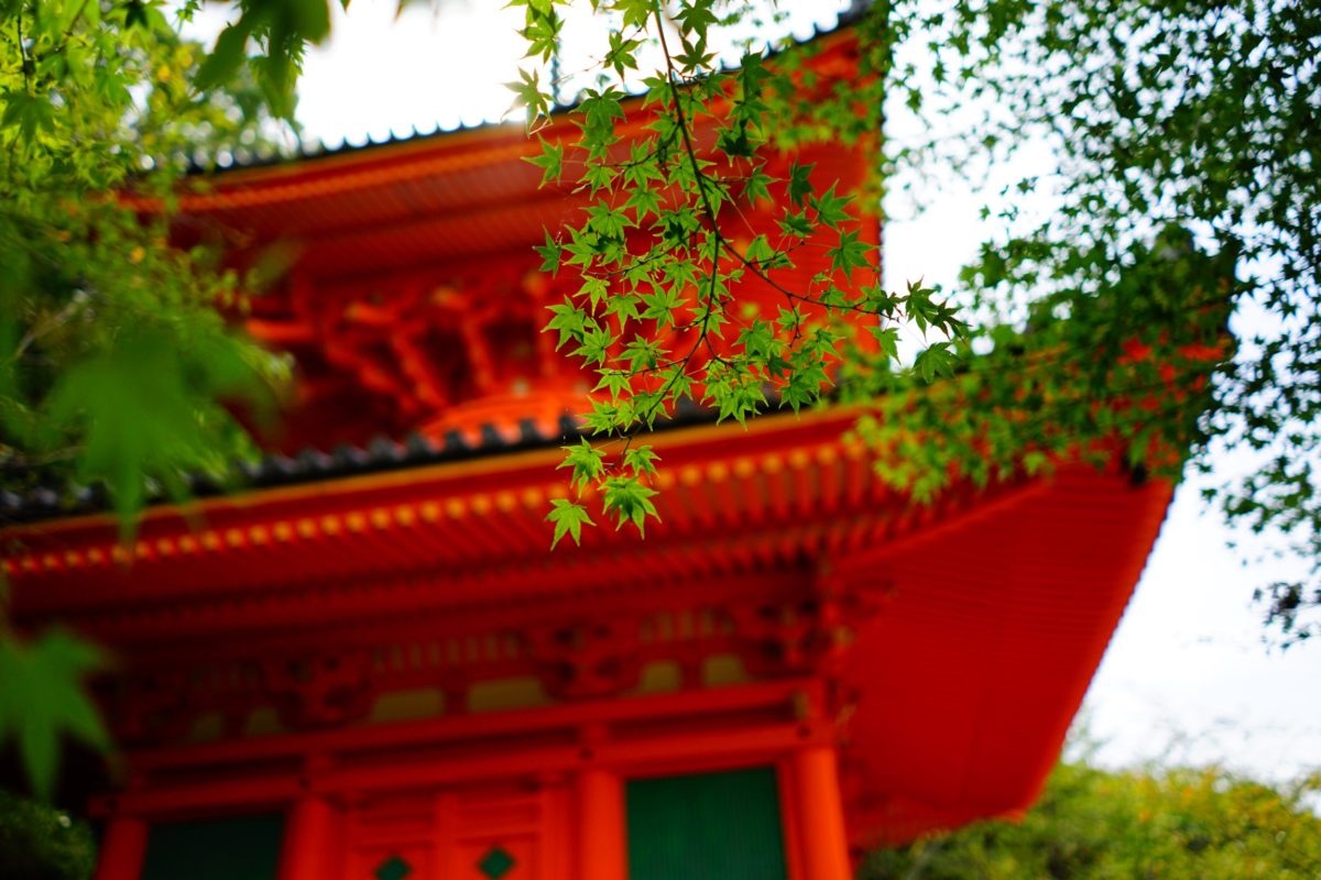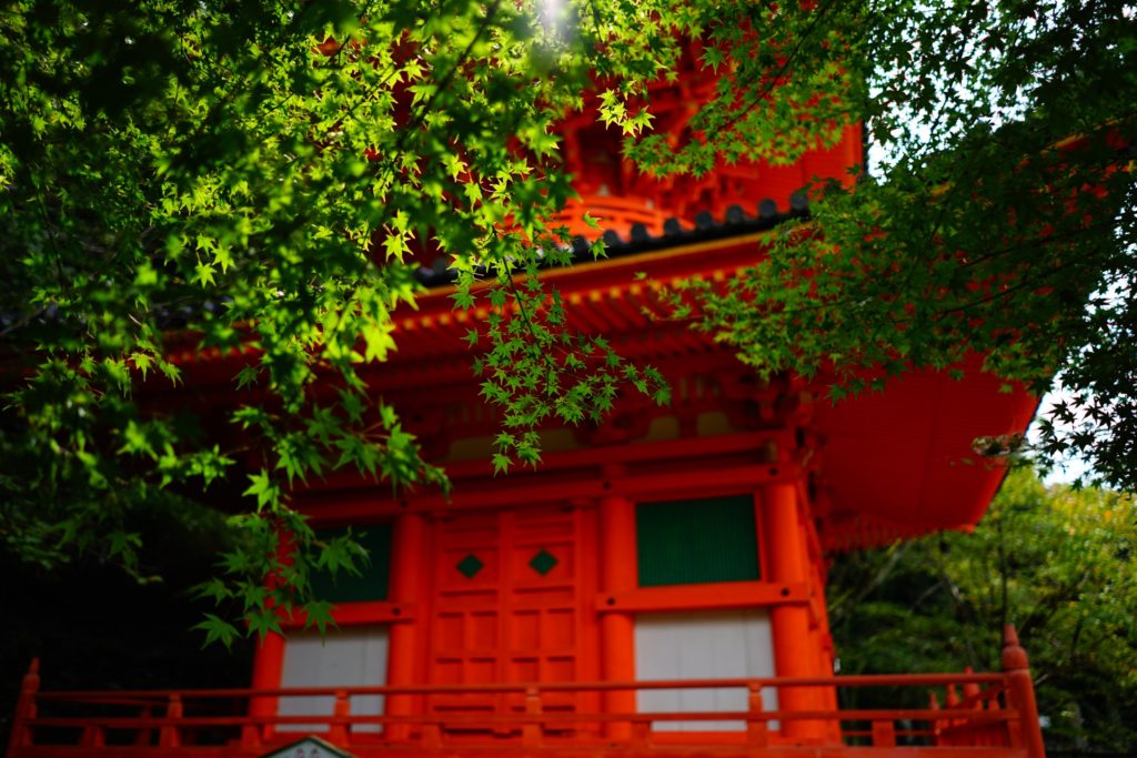 御本尊にお参りしたら、本堂よりさらに上にある多宝塔に行ってみましょう。こちら室町時代建立で朱塗りの塔に青もみじが映えて非常に印象的です。