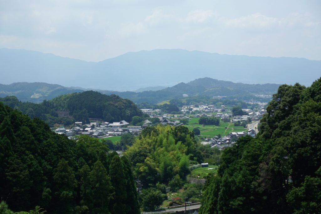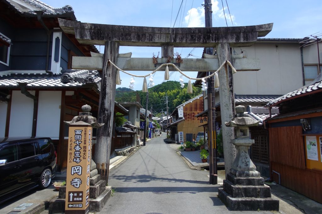 岡寺へはこの赤カメバスに30分ほど乗車して岡寺前で下車し10分前後歩きます。この付近、古めかしくて良い感じの景色があり、撮影スポットに事欠きません。ただ、道が狭いですが車はそこそこ通るので気をつけてください。