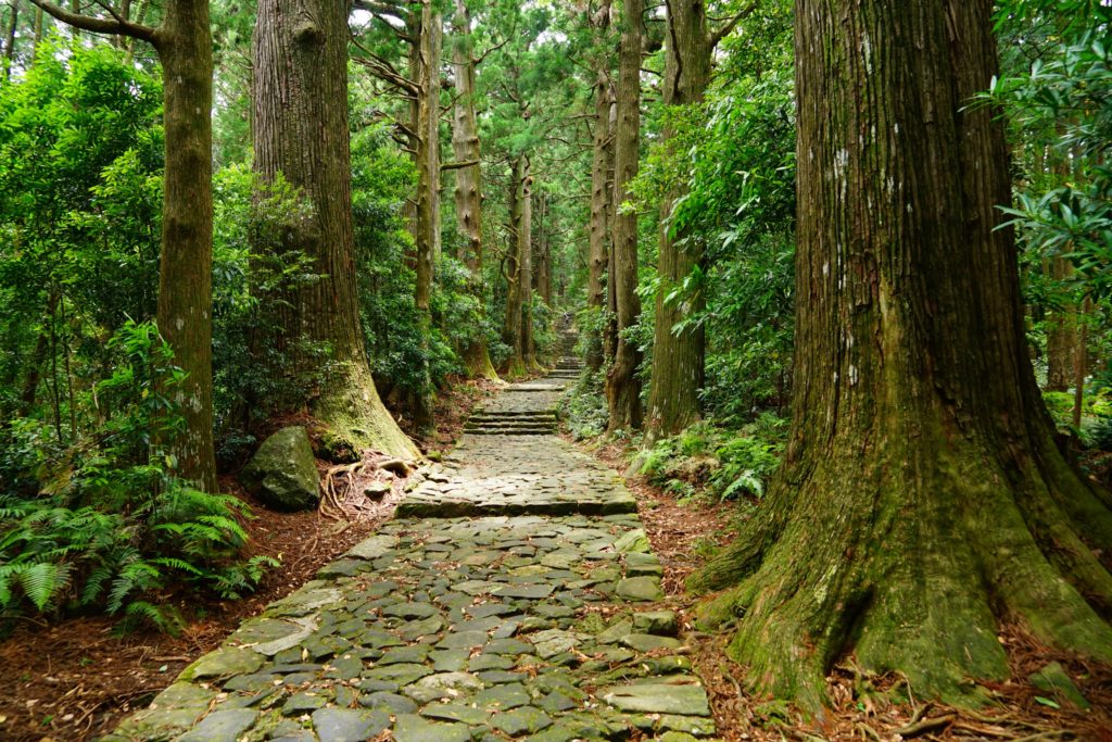JR天王寺駅から特急くろしお号に3時間40分ほど乗車(自由席6,370円)すると紀伊勝浦駅に到着します。ここから熊野交通バスの那智山方面行きバスに乗車します。終点の那智山まで行くよりは、せっかくですので熊野古道を少し歩いてみたいです。30分ほど乗車し「大門坂駐車場前」バス停で途中下車すると、熊野古道の入り口がすぐです。入り口近辺は自家用車で来た観光客などが居ますが、薄暗い石畳の道をどんどん登っていくと次第に人影が減ってきて、厳かで神聖な雰囲気になってきます。古道を歩き始めてから40分ほどで青岸渡寺に到着しますが、ちょうど熊野古道を感じるにはちょうどいい距離ではないでしょうか。