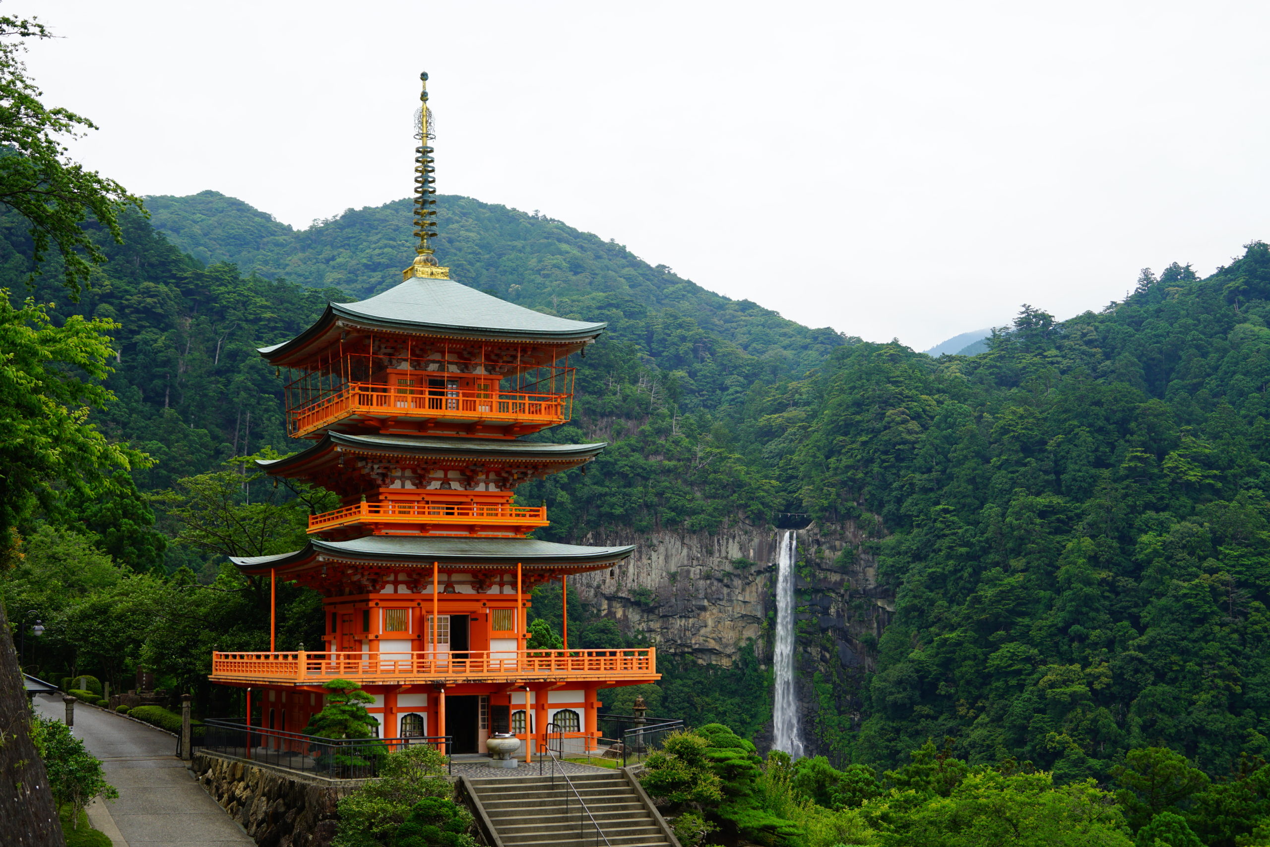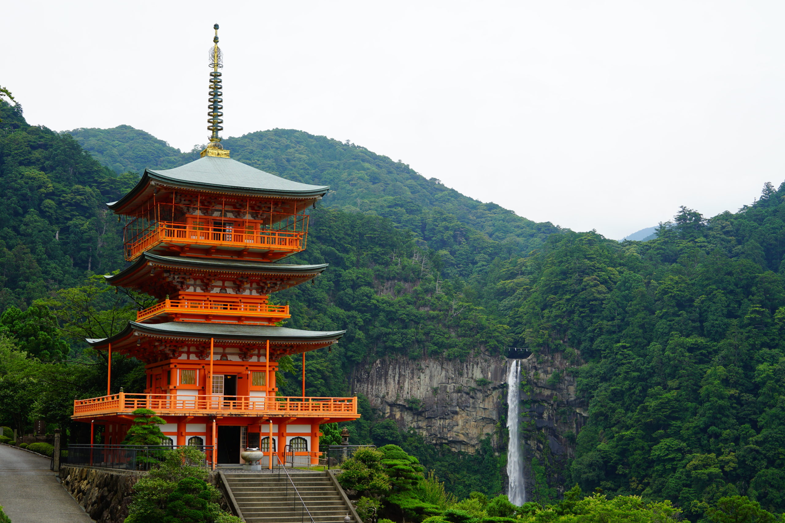 境内の本堂向かって右遠方に、昭和47年に約400年ぶりに再建された三重塔と那智の滝が並んで見える絶景があります。あまりにも決まりすぎていて絵的なインパクトは三十三所随一だと思います。